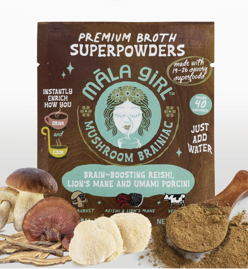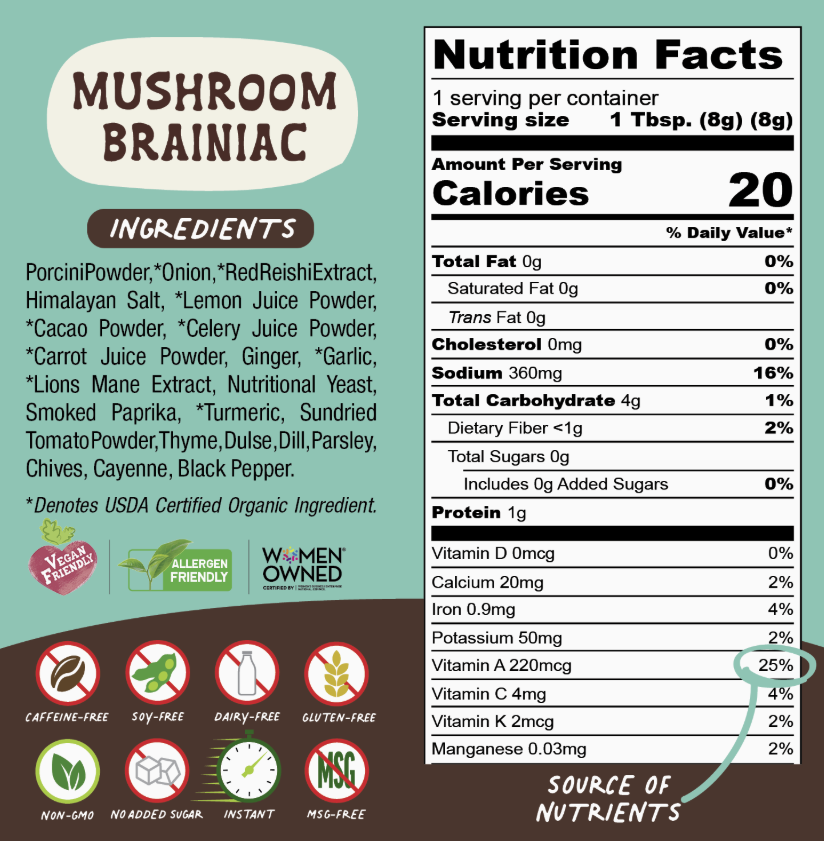 porcini powder, *onion, *red reishi extract, himalayan salt, *lemon juice powder, *cacao powder, *celery juice powder, *carrot juice powder, ginger, *garlic, *lion's mane extract, nutritional yeast, smoked paprika, *turmeric, sundried tomato powder, thyme, dulse, dill, parsley, chives, cayenne, black pepper